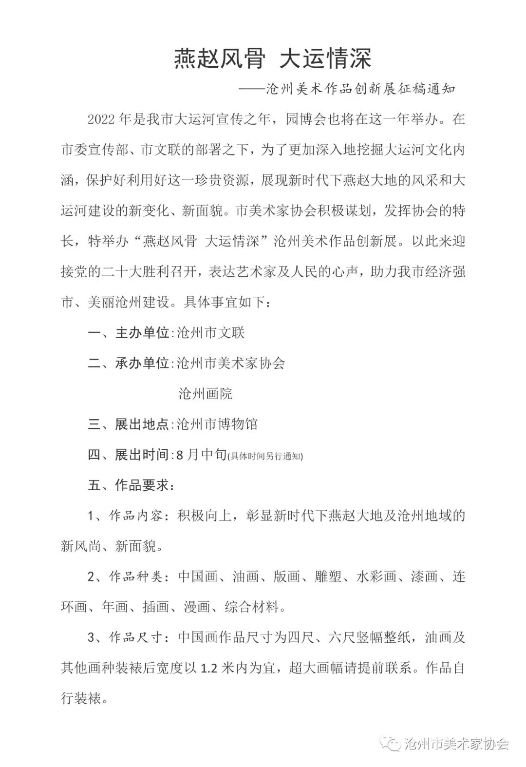 “燕赵风骨·大运情深”——沧州美术作品创新展征稿通知